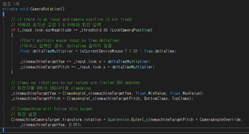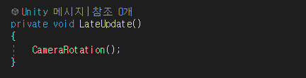 해당 Script에서 카메라 회전을 담당하는 함수는 'CameraRotation()'이다. LateUpdate()에서 호출되며 Update()에서 호출되지 않는 이유는 'Player의 움직임이 완료되기 전 카메라가 이동할 경우, 떨림 현상이 발생'하기 때문이다.